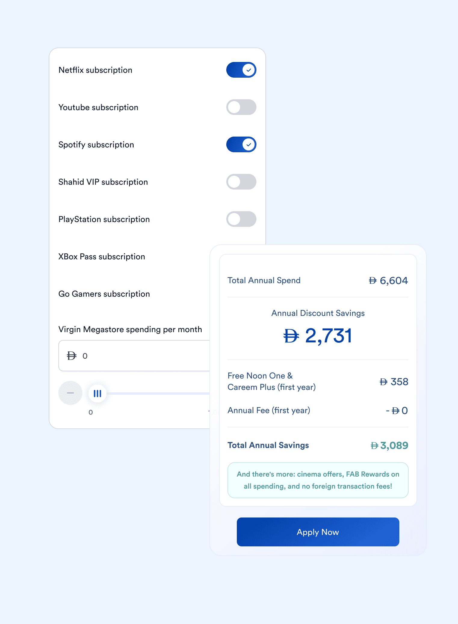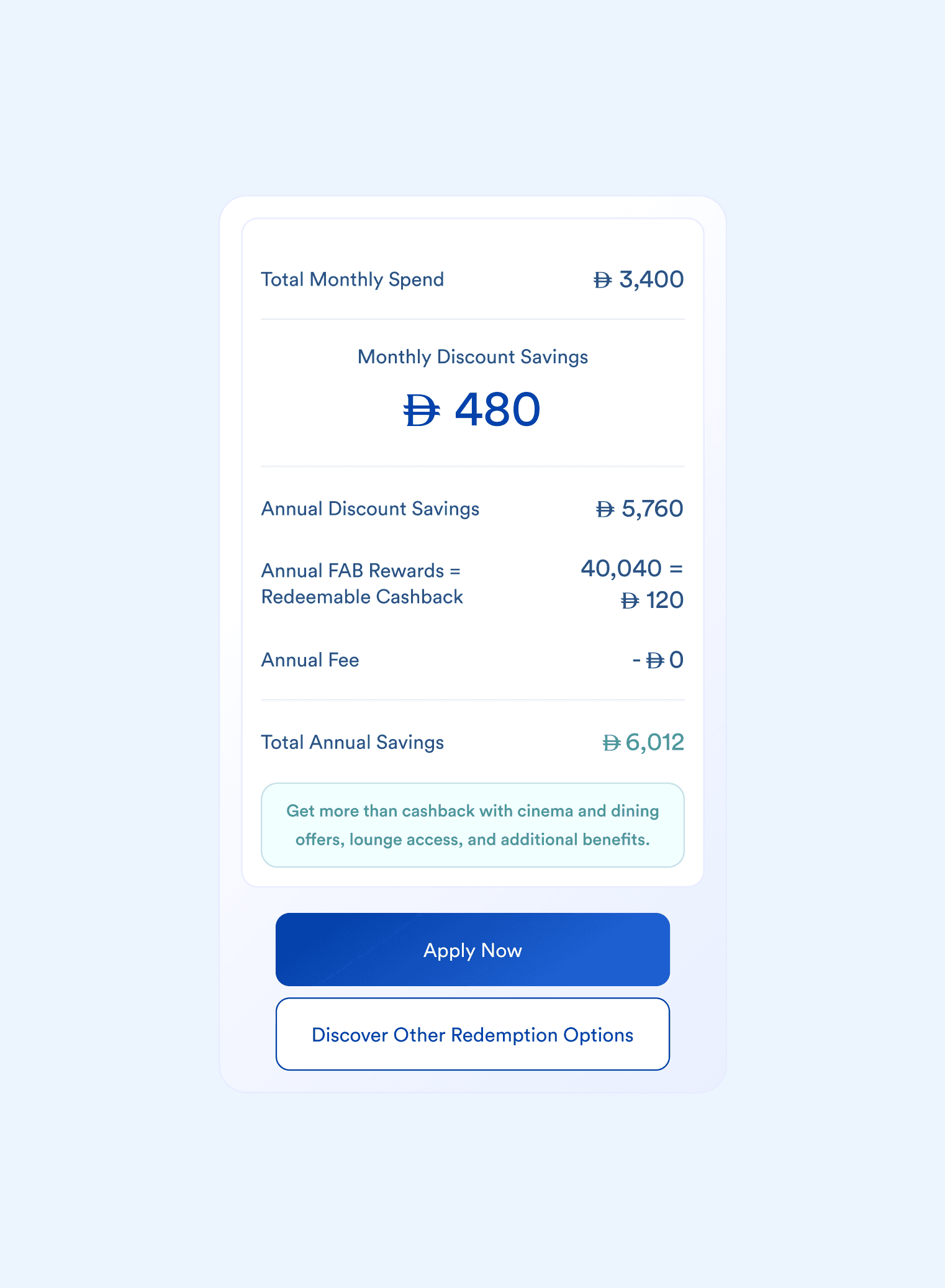 Calculates the total monthly FAB Rewards based on the user’s spending inputs and the card’s reward rules.
